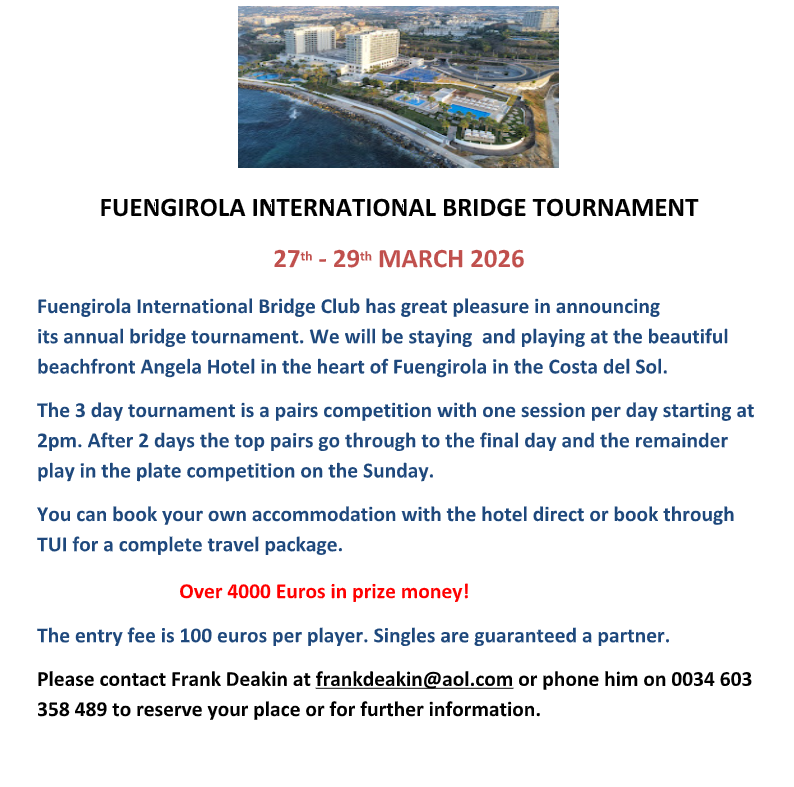 Heb jij zin om het laatste weekend van maart (vrijdag 27 t/m zondag 29) te bridgen in Fuengirola, Zuid-Spanje? Noteer dit toernooi dan alvast in je agenda. Medewerkers van IMP zijn ook van de partij. Het driedaagse toernooi start ´s middags om 14.00 uur en na twee dagen zal het bovenste deel van het veld doorstromen naar de finale op zondag terwijl de rest van het veld die dag een aparte competitie speelt.