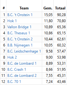De stand na 6 wedstrijden in de Meesterklasse viertallen: