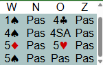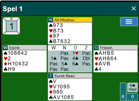 en omdat troefvrouw valt, worden eenvoudig 12 slagen gehaald. Een soort boemerang effect. Aan de andere tafel bemoeien de zussen De Wijs als NZ zicht niet met het bieden en dat ziet er als volgt uit: