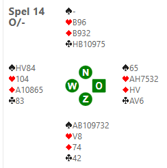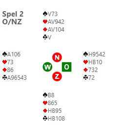 V, dan een derde harten (over)getroefd door west. Deze speelt troef na. Oost raapt zijn hoge troeven op en gaat van slag met harten of troef. De leider mag daarna in de ruitenvork van west spelen en verliest drie slagen in harten, vier in ruiten en twee in troef. Dat betekent 6 down en -11 imps. Met een datumscore van -810 scoorden de ow-paren die braaf 4