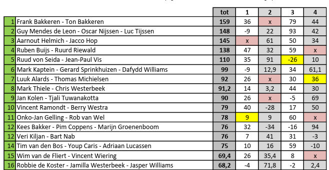 De finalisten van het IMP & Lombard Topcircuit die op zaterdag 9 en zondag 10 mei in Rotterdam gespeeld wordt, zijn bekend. Pim Coppens en Merijn Groenboom wonnen de vierde en laatste voorronde met +94 imps. Op de tweede plaats Jan Kolen en Tjali Tuwanakotta met +69 en derde Mark Kaptein en Daffydd Williams met +61. Klik op het plaatje van de NBB voor de hele uitslag.
