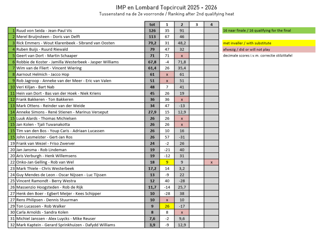 Vandaag wordt de derde voorronde van het IMP & Lombard Topcircuit gespeeld. De stand na twee voorronden ziet er als volgt uit: