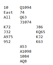 A in zuid te plaatsen en om die reden speelde ik een schoppen naar dummy. Zuid speelde klein en de heer hield de slag. Ik raapte nu alle hartens en ruitens op, eindigend in dummy. Noord had daarop twee schoppens laten gaan en zuid een. Op de volgende schoppenslag, vielen daardoor