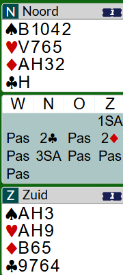 V een eerlijke kaart is). Dat is goed nieuws want dan zitten de hartens 3-3. Ik raap daarom mijn vier hartenslagen op en ga daarna van slag met schoppen. Oost kan daarna nog een schoppen oprapen maar moet onder