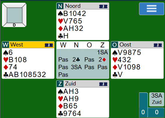 V gaat vallen voordat ik aan de hartens begin. West helpt me snel uit de dromen, want op