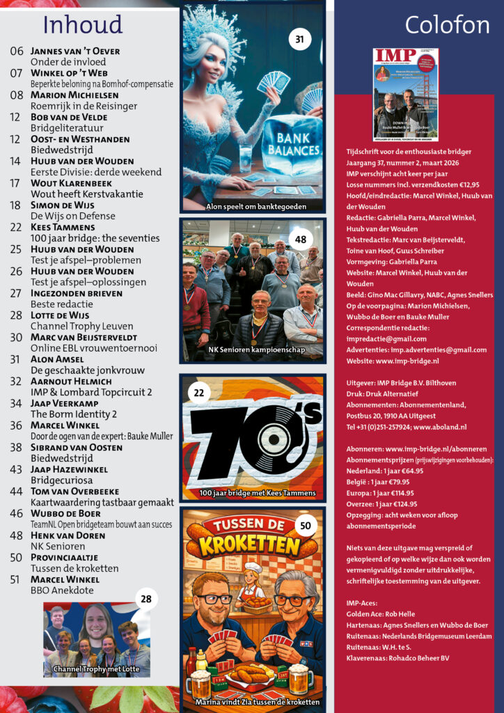 Het volgende nummer van Bridge Magazine IMP – 37ste jaargang nr. 2 – verschijnt half maart 2026.