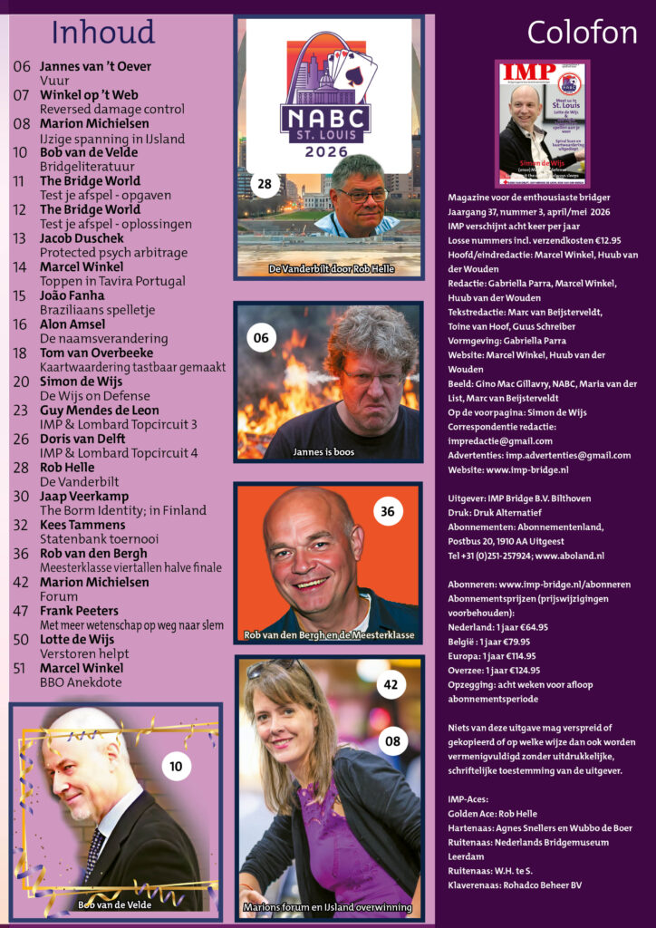 Het volgende nummer van Bridge Magazine IMP – 37ste jaargang nr. 3 – verschijnt eind april 2026.