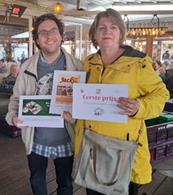 Het bieden was enthousiast maar het is wel mooi afgemaakt. En zeg nou zelf, dit soort verhalen zijn toch een stuk leuker aan de bar dan de “normale” dingen. De winnaars Heleen en Sean Adams wonnen een abonnement op Bridgemagazine IMP en op JACK, een bridgeprogramma waarmee naast gewoon spellen spelen je goed je nieuwe conventies kan oefenen, maar ook Professor Jack kan vragen wat je het best kan bieden op een bepaald spel.