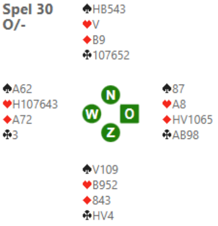 Het slem is nu te maken omdat er een harten plaatje sec achter de lange hartens zit. Enkel hartens 3-2 is niet genoeg met schoppen uit.