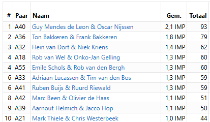 De derde voorronde van het IMP & Lombard Topcircuit op 10 januari is gewonnen door Guy Mendes de Leon en Oscar Nijssen met +93 imp over 45 spellen. Op de tweede plaats eindigden Frank en Ton Bakkeren (+79), derde werden Hein van Dort en Niek Kriens (+62).