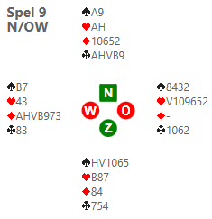 wist te bereiken, te spelen door Noord. Na een hartenstart trok de leider de troeven en omdat hij kennelijk wist hoe de schoppens verdeeld zaten (West heeft een zevenkaart ruiten en een doubleton klaveren en minsten twee hartens), nam hij de snit op de boer en verloor daarna ook nog 4 slagen in ruiten en was dus 4 down voor minus 12.