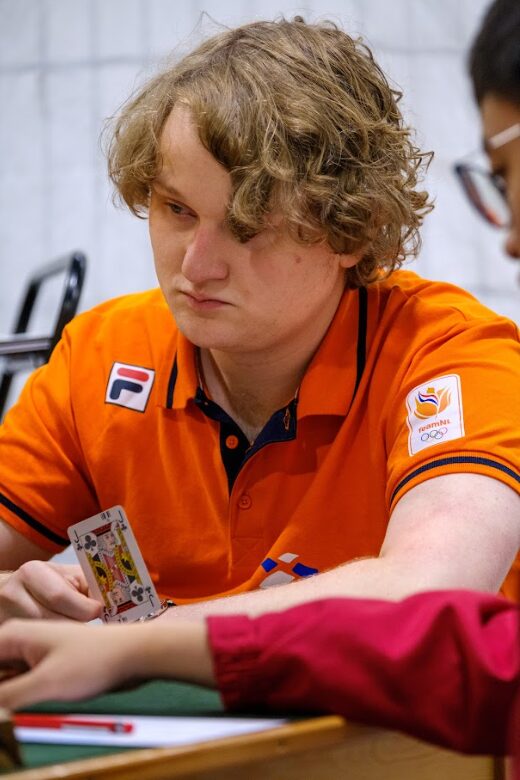 De winnaars verdedigden als OW 3SA, te spelen door Noord. Oost kon geen ruiten uitkomen en de leider haalde 12 slagen, een gelukje voor NZ. Aan andere tafels was er meer vuurwerk. Daar doubleerde west het eindcontract maar daar waren twee paren niet van gediend en redoubleerden. In mijn beleving is dat een “doubt showing redouble” dat aangeeft te twijfelen over de kwaliteit van de ruitenstop. Tot mijn verbazing bleven deze twee parenzitten in 3SA geredoubleerd en noteerden +1400 toen ook hier 12 slagen werden gemaakt en schreven 13 imps bij. Vier andere paren kozen een veiligere haven en legden aan in 4. Er was een paar bij dat 6