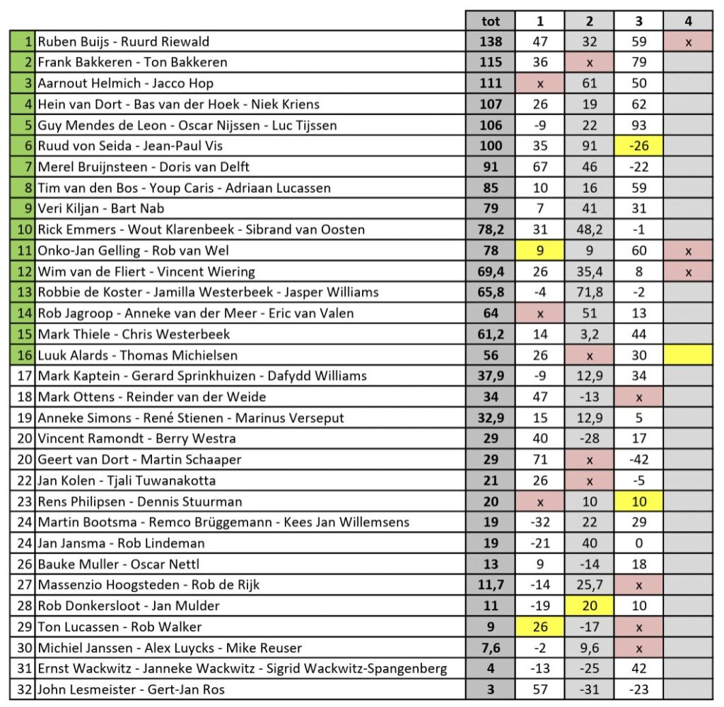 Deze keer deden 56 paren mee die niet alleen speelden voor de geldprijzen (€1000,- voor nr. 1 en nog altijd €100,- voor het paar op de tiende plaats) maar ook voor de totaalstand na vier voorronden die bepaalt welke paren zich plaatsen voor de finale in mei. De tussenstand na drie voorronden: