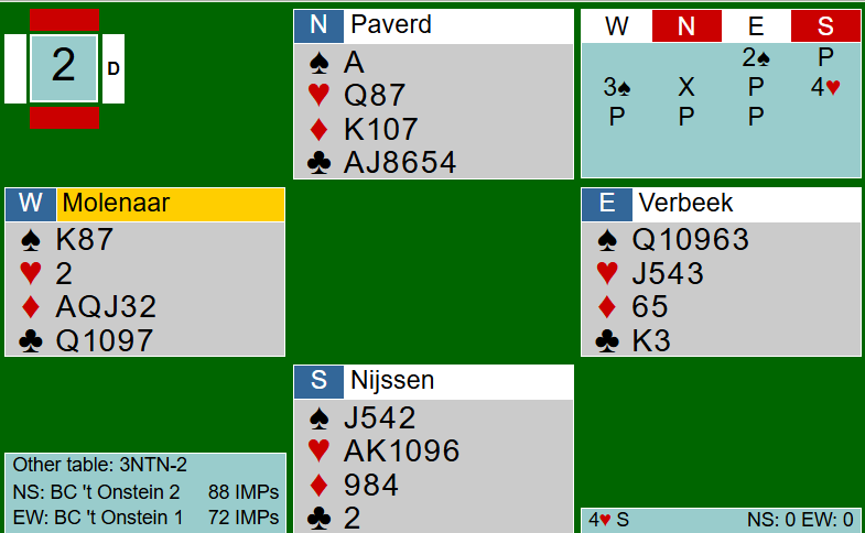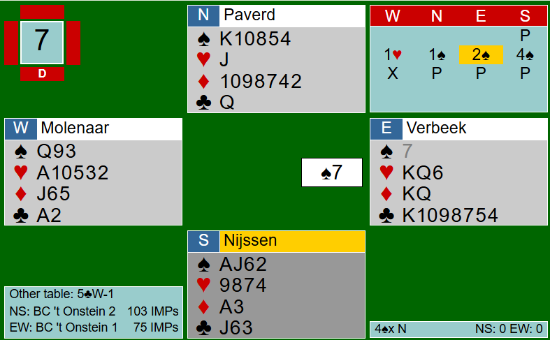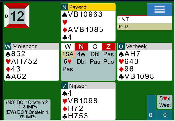 ). 101-72. Al twee spellen topamusement. Slechts 32 spellen vandaag (wordt het steeds korter?), het is zaak snel kansen te creëren en te grijpen voor team ‘1’. De eerste klapper is voor ‘2’, zeker als Tim voor een troefuitkomst kiest.