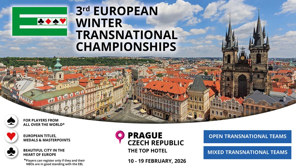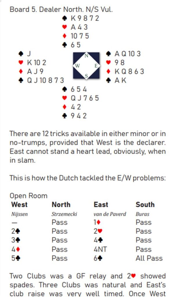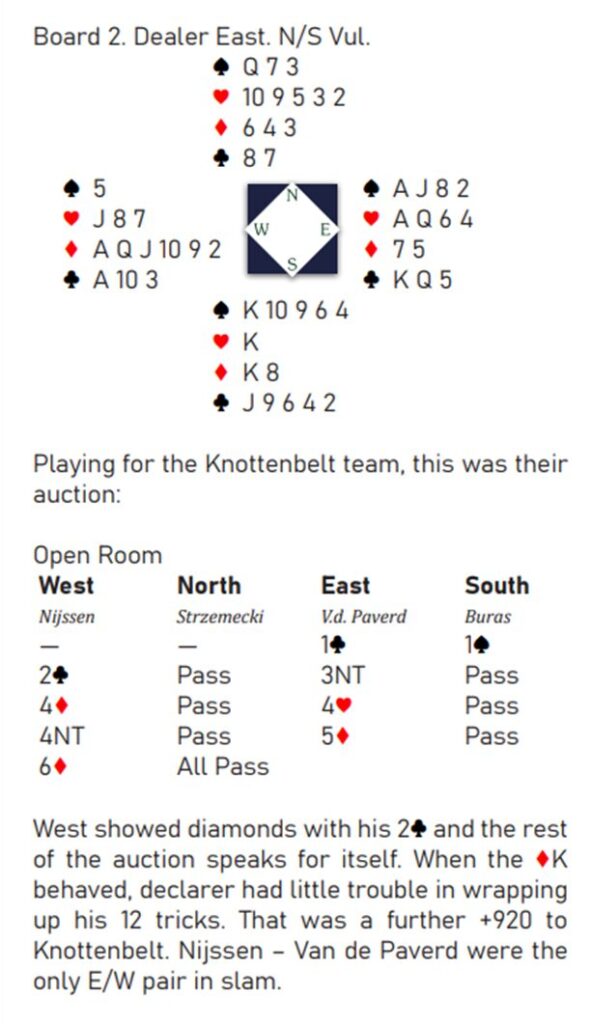 Er waren jaren dat ik elke ochtend allereerst uitzocht wie (natuurlijk Nederlandse paren) er wanneer op BBO speelden. Dat heilige vuur is er een beetje af maar vanzelfsprekend volgde ik de belevenissen van OzPaaf (Oscar Nijssen- Tim van de Paverd) in de European Winter Transnationals in Praag. Ze denderden overal doorheen en namen in de eerste zitting van de finale een leuke voorsprong (37-2 imps). Uit het bulletin pak ik een paar mooie slems.