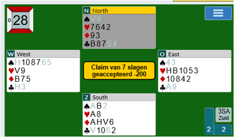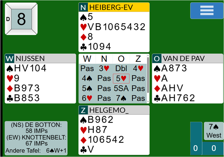 Elk teken van leven (zoals 6♥) was kennelijk voldoende voor Tim. Of gaf 6♥ ♠HV aan? het staat er jammer genoeg niet bij. Het blijft spannend:78-58. Moet ik ook nog schaatsen volgen (het leven ís geen lolletje, ook al denkt de IMP-redactie dat).