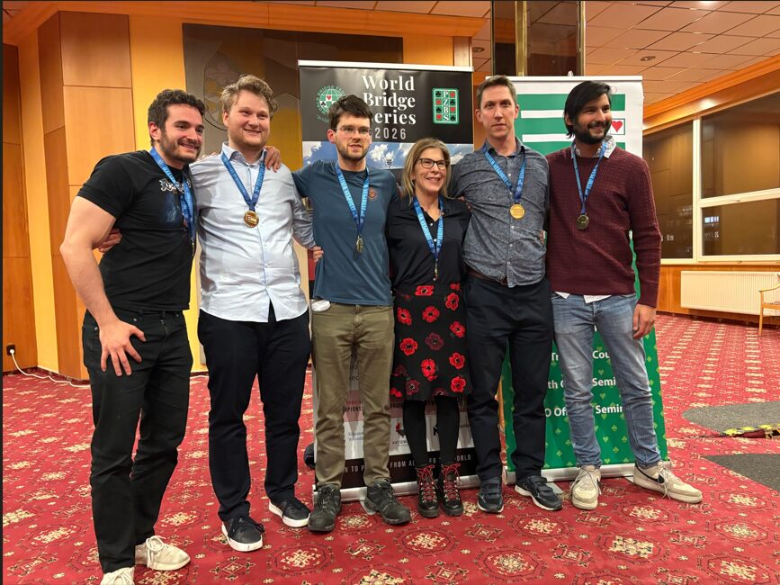 Schoppen tegen 3SA uit voor ♠V in de dummy. Een kleine klaveren en Tim er als de kippen bij met ♣A en schoppen door voor twee down. Een mooie gouden plak voor het Nederlandse paar dat we as weekeinde aan het werk gaan zien in MK Viertallen-finale. De razende IMP-reporter is er bij.