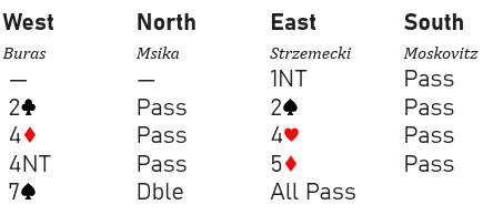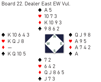 Dat was niet het goede eindcontract. De leider wist nog 8 slagen te halen op pure kracht in de zijkleuren (“gelukkig zaten de schoppen 2-2 en de harten 3-3, partner!”). Dit grapje kostte 17 imps want aan de andere tafel werd 6 geboden en gemaakt. Ook de Polen hadden een ramp op dit spel: