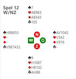 Nou, met de buren kwetsbaar opent je partner (Marc van Beijsterveldt) tijdens de Tweede Divisie viertallen in West op de eerste hand met 4. Vroeger had je dan een achtkaart, maar omdat je die bijna nooit krijgt, zijn het er heel vaak 7, met een vierkaartje in een lage kleur ernaast. Omdat zijn schoppenkleur behoorlijk beroerd is, heeft hij er misschien toch wel 8. Of, een 7-5 misschien? Nee, toch geen six-seven? Dat zou dan eerder een seven-six zijn. Er zijn vanuit jouw oogpunt 13 klaveren weg, dus als partner naast zijn gammele schoppens er iets naast heeft, dan is de kans groot dat dit klaveren zijn: