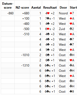 Er was een paar in de zaal dat 7 wist te bereiken. Uiteraard voorzien van een doublet. Het bleek een goed doublet, want de leider speelde een keer te vaak troef en ging één down. Hou ze in de gaten, die six-sevens. Ze schijnen gemiddeld elke 50 jaar een keer voor te komen. De frequentiestaat op dit spel: