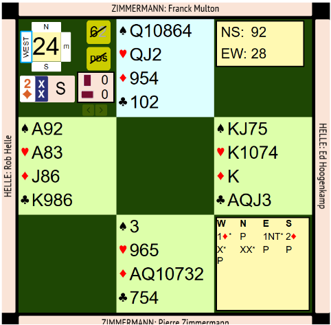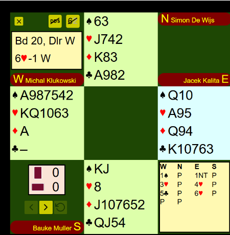 roet in het eten. Jammer genoeg bleek het slem ook down na een andere uitkomst. Na een 4♠+3, op simpel snitje tegen -1430 begint het catastrofale vorm aan te nemen 28-92 imps, poehee. Je hoopt dat Zimmerman een keer lelijk uitglijdt en dat lijkt inderdaad te gebeuren.
