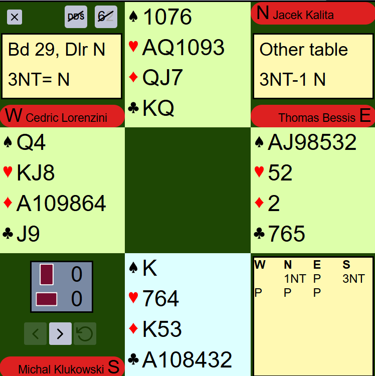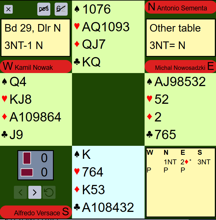 Aan de andere tafel mengde Nowosadski zich wel in de bieding, maar was het eindcontract hetzelfde. Ook hier een kleine schoppen voor de secce heer. Sementa nam uiteraard ook de tweede klaveren in dummy over, maar speelde in de eindpositie een harten naar zijn aas. Hij vermoedde kennelijk dat oost de heer had sec gezet. Dat was niet het geval en team Zimmermann schreef +12 imps.