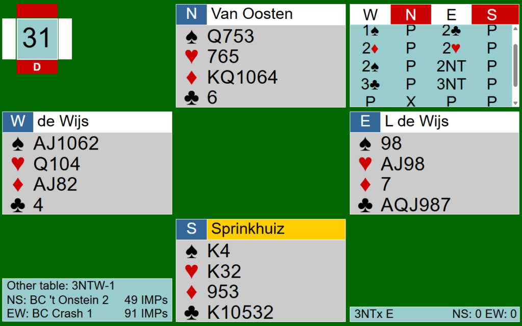 A en vier slagen in klaveren. Aan de andere tafel zat het contract in de westhand en ondanks de uitkomst met een kleine ruiten lukte het de leider niet om 9 slagen te halen.