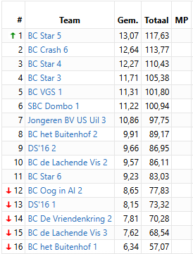 In de Tweede Divisie is het andere koek: in `Groep 3 Midden´ speelt B.C. Star met de teams 3, 4, 5 en 6. Je verwacht dan misschien dat het derde team hoger staat dan team vier, maar dat is niet het geval. Team 5 staat momenteel bovenaan en team 6 bijna op degraderen, terwijl team 3 vierde staat en team 4 derde. Er promoveert slechts één team naar de Eerste Divisie, terwijl er 5 teams zullen degraderen naar de hoofdklasse.