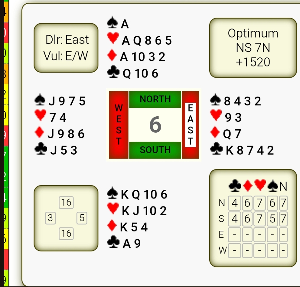 Een superleuk spel is spel 6. Stel dat je in 6SA zit dan win je van alle paren die in 6 blijven steken. Maar wat als deze paren een overslag weten te maken? Dan kun jij dat in 6SA ook maar beter doen. Stel dat West uitkomt met een harten tegen 6SA. Je telt 3 slagen in schoppen, 5 in harten, 2 in ruiten en 1 in klaveren. Dat zijn er 11 dus hoe wil je een dwang opzetten als je daarvoor een slag tekort komt? Met open kaarten is het makkelijk te zien dat West zowel de ruitens als de schoppens bewaakt. Dus het zou mooi zijn als hij ook de klaveren moet bewaken. Omdat je op de hoge schoppens uit je hand in dummy twee klaveren weggooit, heb je er niks aan wanneer west klaverheer heeft. Die kan hij gewoon weggooien, waarna zijn partner de boer kan vasthouden. West moet dus