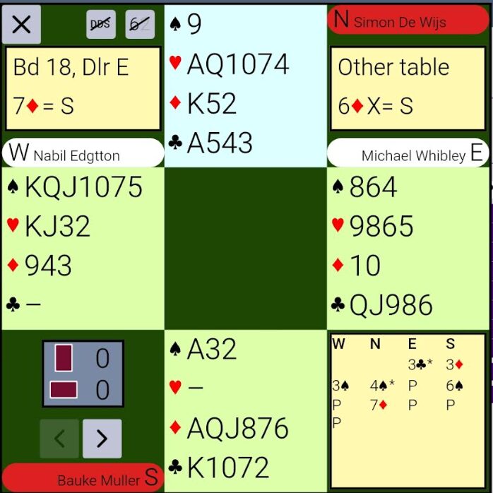Simon de Wijs was als noord onderweg naar een ruitenslem en deed een cue met 4. Hoe dat bod door Bauke werd opgevat, is mij niet duidelijk, maar het lijkt erop dat hij het als echte schoppens heeft geïnterpreteerd. Simon had 4