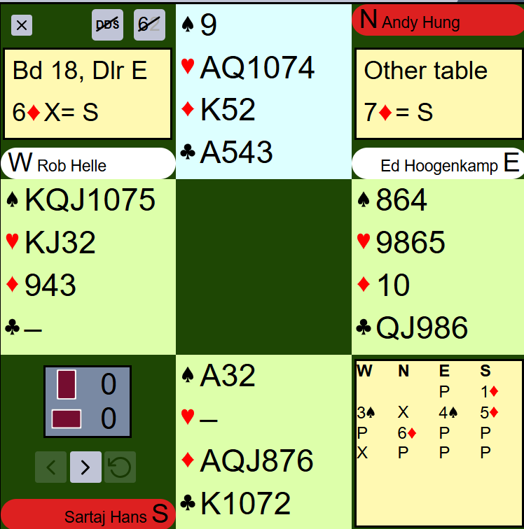 Aan de andere tafel werd zuid leider in 6 dat werd voorzien van een soort Lightnerdoublet van Rob Helle. Mocht partner oost namelijk
