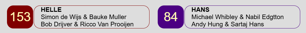 Uiteindelijk won team Helle met grote cijfers de kwartfinale; dit was de opstelling met de eindscore na de vierde zitting: