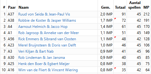 Ruud von Seida en Jean-Paul Vis hebben met +91 de tweede zitting van het IMP & Lombard Topcircuit gewonnen. Robbie de Koster en Jasper Williams werden tweede met 72 imps en Aarnout Helmich en Jacco Hop derde met 61.