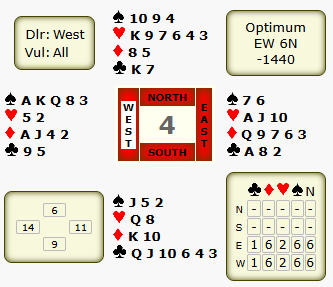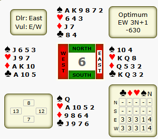 Dit keer heb ik de frequentiestaat erbij gezet. OW missen niet alleen de goede uitnemer van 5, ze kwamen aan 4 van de 7 tafels in een schoppencontract terecht. Onze ongedoubleerde 4