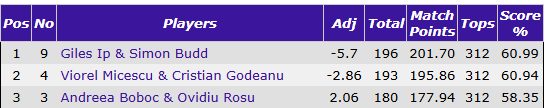 Ik was even een moment onachtzaam, want nadat ik H en A gespeeld had, vergat ik eerst de twee hoge ruitens uit dummy mee te nemen voordat ik een derde klaveren speelde. Mijn vier ruitenslagen had ik vakkundig teruggebracht naar 3. Toen bleek dat de schoppenkleur op slot zat, was ik samen met de winnaars de enige die met 8 slagen eindigde. Een zure 8%. Je zit op deze manier niet voor een prijs te kaarten…