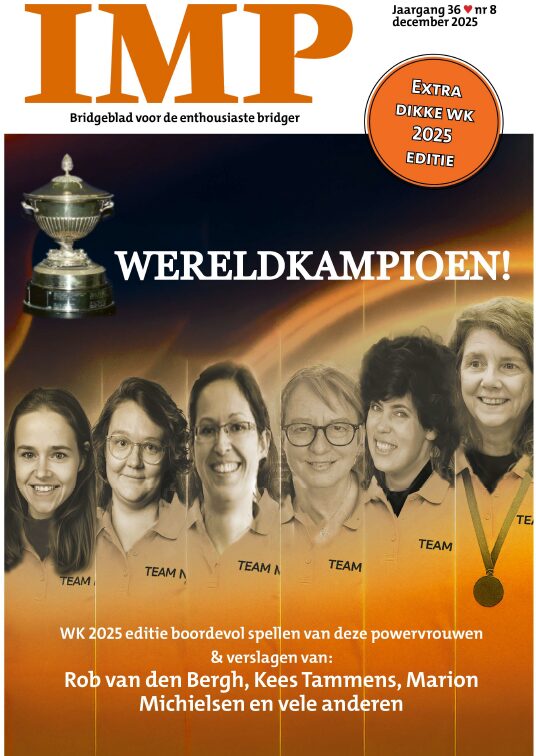 De Nederlandse vrouwen zijn op de WK in Denemarken na 25 jaar opnieuw wereldkampioen geworden. Bridge Magazine IMP besteedt een groot deel van IMP 8 aan deze WK. De uitgave wordt ook veel dikker dan een reguliere editie, namelijk 56 pagina’s. Met recht een verzameleditie boordevol spannende spellen.